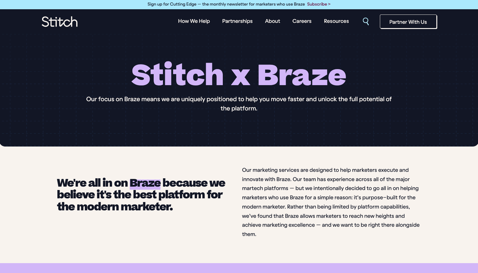 High Alpha portfolio company Stitch is a fantastic example of focus in their GTM motion. Started by former Lev CEO Michael Burton, Stitch has become so adept at generating referrals that they will be the first to tell you their number once audience as a Braze-focused marketing services company is Braze account executives. While they have other channels they're able to bring deals in through, they are highly focused — and highly efficient — at growing through building intentional relationships at Braze.