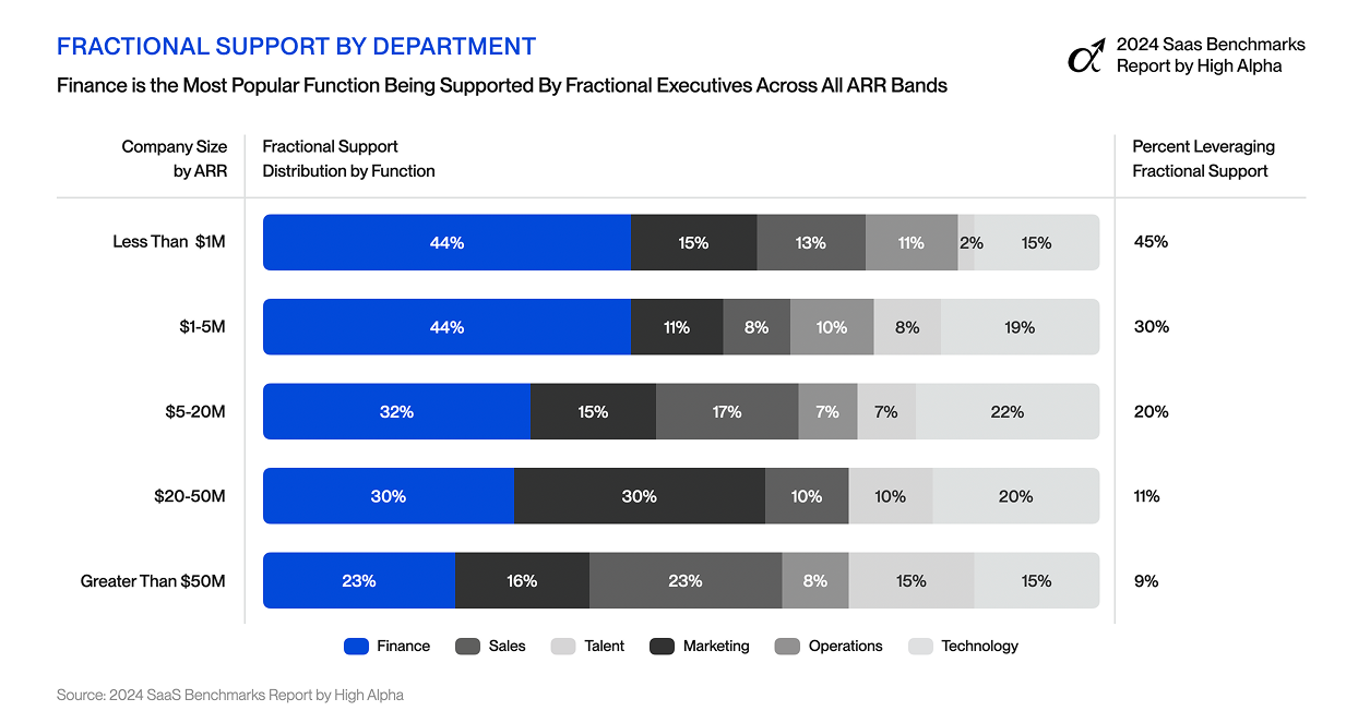 The 2024 SaaS Benchmarks Report offers insights into how successful companies are structuring their teams. A key takeaway for early-stage founders is the significant role of fractional support. As departmental distributions continue to evolve, with companies prioritizing lean, impactful teams, the ability to tap into specialized expertise without the overhead of a full-time hire has become a game-changer.