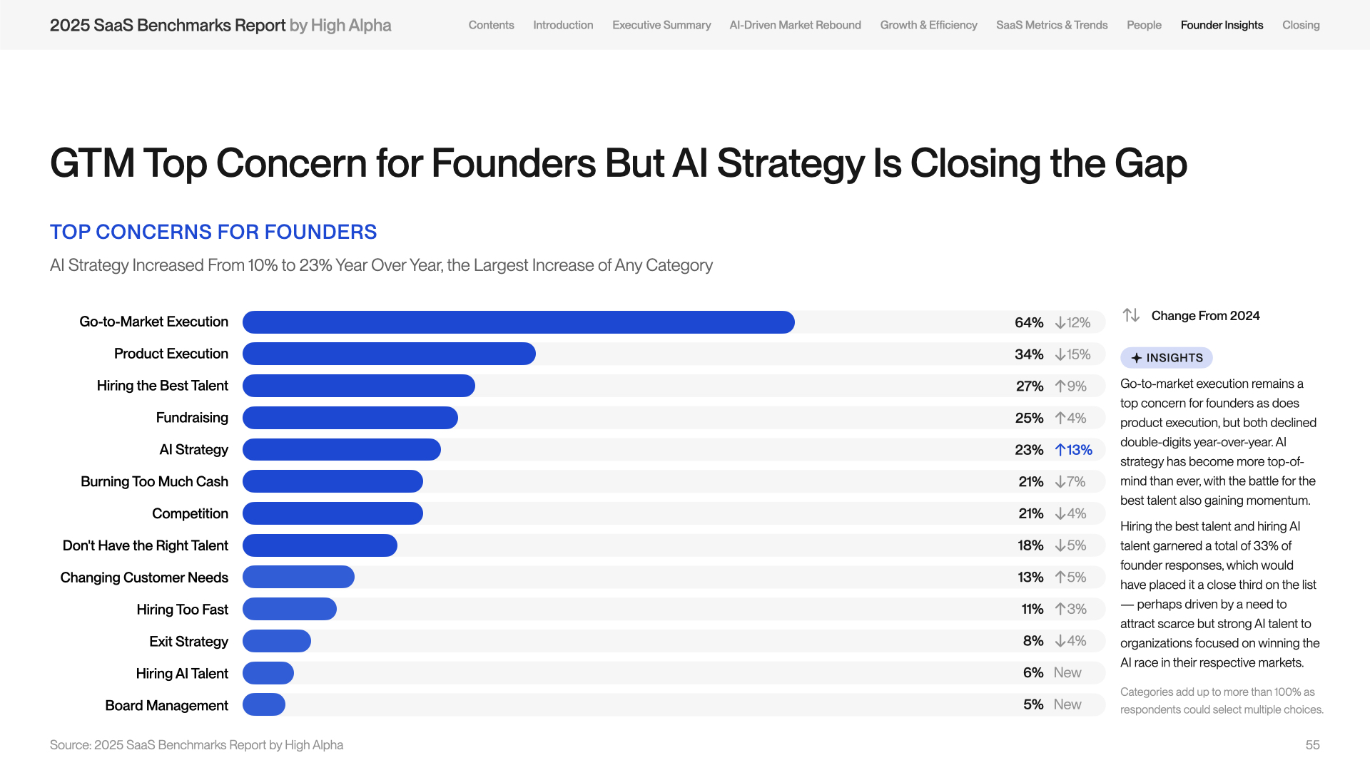 The biggest jump in what keeps founders up at night this year was AI strategy. While GTM and product execution remain the top concerns, the need for AI talent — someone who is AI-fluent and can drive real organizational change — has become a pressing concern as product execution difficulty has decreased.